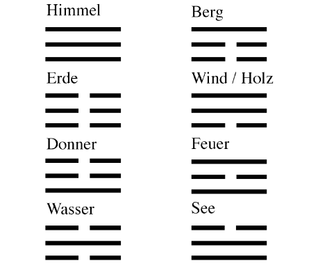 Das Zeichen weist auf eine schwierige Lage hin. Das Schwache geht hinter dem Starken her. Man hat es mit unzugänglichen Menschen zu tun und erreicht nur etwas, wenn man sich an die guten Sitten hält. Mit gut durchdachten Kompromissen kommt man weiter. Marschiere am Schwanzende des Tigers, dann beißt er Dich nicht. Du glaubst an Dein Glück? Dann marschieren los, ohne sich um die Hindernisse zu kümmern.